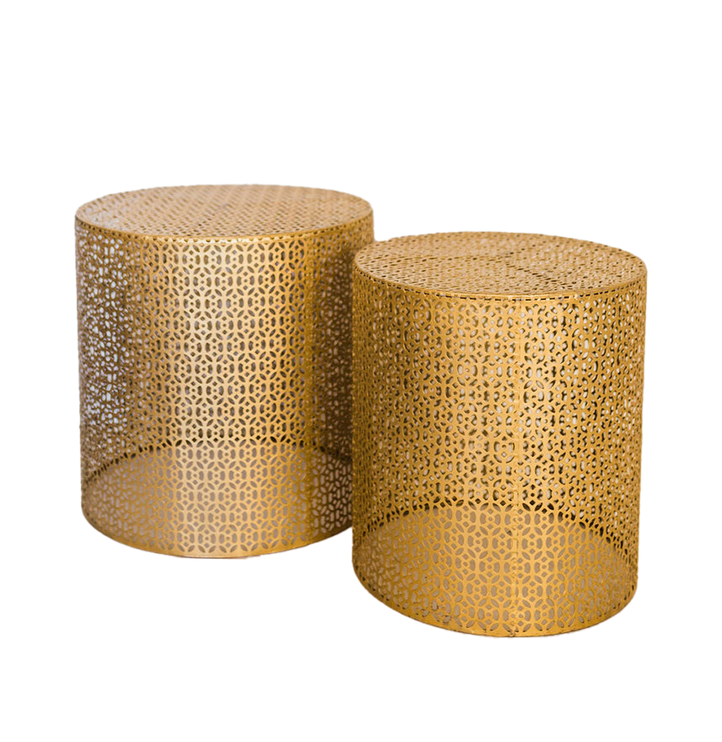side tables & Poufs Chic side tables and poufs that add both style and functional comfort to your wedding lounge setup. geometric brass moroccan side table pressed gold ANGLED white washed iron tripod wood top with iron leg live edge with gold leg african wood modern wicker small silver wooden drums white garden stool white chinoiserie garden stool martini brass live edge bird cage linen pouf blue velvet pouf morrocan pouf grey velvet pouf